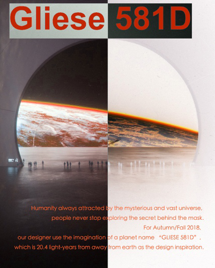 设计师心中的Gliese 581 D星球里,人们的穿着带着一些蒸汽朋克(Steam Punk)的元素。将未来感与实穿性时装相结合,希望借此说明人们进入太空探索的最终还是自己的内心。所谓的神秘并不产生自未知的外部空间,而是来自人类的存在本身。